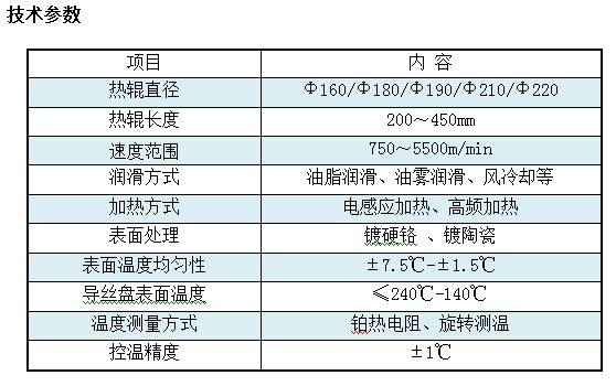 1. 滌綸、錦綸絲熱輥利用電感應(yīng)加熱,熱管均溫或分段控溫技術(shù),使熱輥工作區(qū)表面溫度均勻。能滿足不同的工業(yè)絲、民用絲FDY紡絲工藝的要求